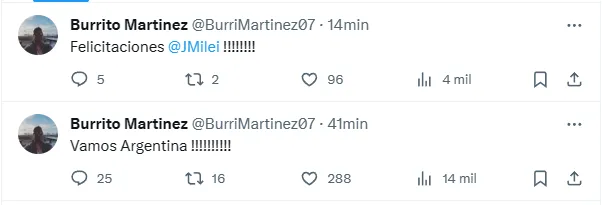 Tras conocerse los primeros datos oficiales, el Burrito no tardó en dejarle su mensaje al libertario a través de su perfil de X. “Felicitaciones, Milei. ¡Vamos Argentina!”, escribió el delantero que supo ser gran figura del fútbol argentino.
