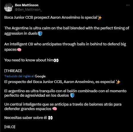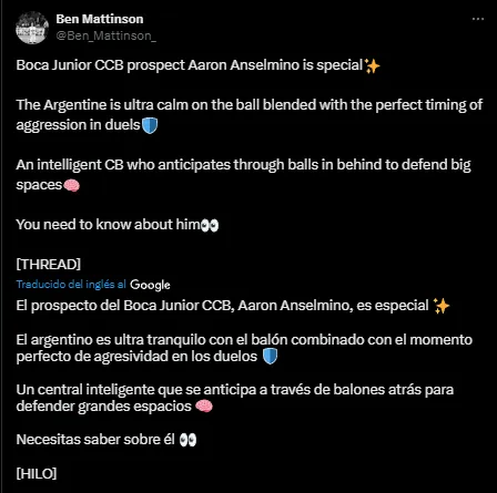 En el mismo, Mattisson cataloga a Anselmino como un defensor con proyección a ser “de primer nivel mundial“. “El prospecto del Boca Juniors, Aaron Anselmino, es especial. El argentino es ultra tranquilo con el balón combinado con el momento perfecto de agresividad en los duelos. Un central inteligente que se anticipa a través de balones atrás para defender grandes espacios. Necesitas saber sobre él“, comenzó en su análisis.