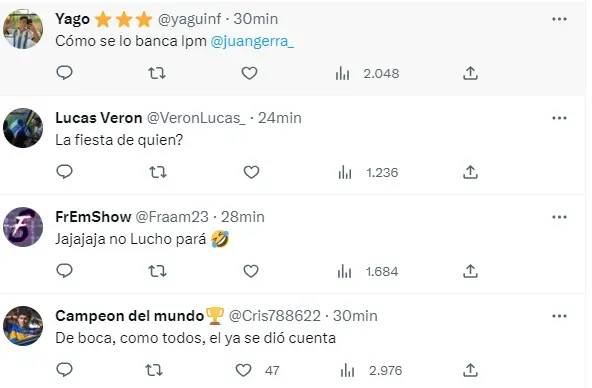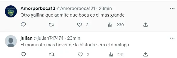 “Otro gallina que admite que boca es el mas grande”, “El momento mas bover de la historia será el domingo”, “De Boca como todos, él ya se dio cuenta”, fueron algunos de los tantos comentarios de los hinchas Xeneizes tras el comentario del ex jugador surgido de las inferiores de Huracán.