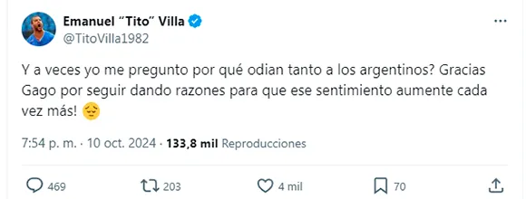 Fue a través de las redes sociales que Tito apuntó contra quien será el entrenador de Boca por entender que no hizo más que aumentar las tensiones entre mexicanos y argentinos. “Y a veces yo me pregunto por qué odian tanto a los argentinos. Gracias Gago por seguir dando razones para que ese sentimiento aumente cada vez más”, escribió en X.