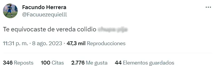“Te equivocaste de vereda, Colidio”, escribió el joven, acompañado por un insulto irreproducible. El posteo se viralizó tan rápido que el pibe lo terminó borrando.