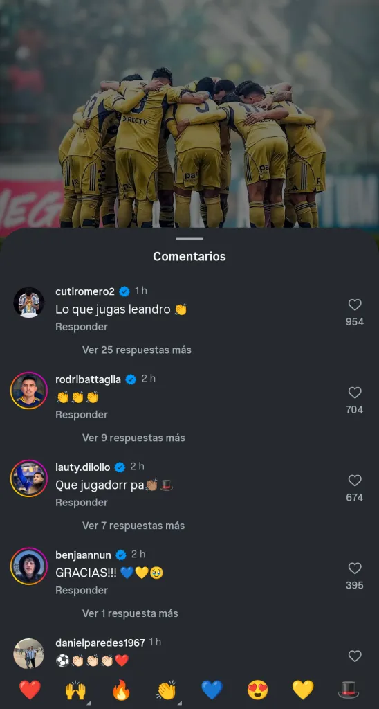Leandro Paredes compartió una publicación en su cuenta de Instagram tras la victoria de Boca ante Aldosivi y fueron varios los jugadores que se la comentaron, entre ellos el Cuti Romero, amigo del volante con quien comparte plantel en la Selección Argentina hace años. El marcador central que sedesempaña en Tottenham le escribió: “Lo que jugás, Leandro”, acompañado del emoji de unas manos aplaudiendo. También se pueden observar comentarios de Lautaro Di Lollo -quien abrió el marcador en el Minella- y de Rodrigo Battaglia, quien convirtió el segundo de la jornada.