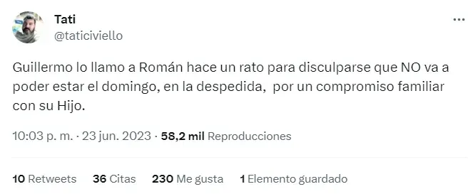 Pese a que en las redes había dicho que iba a asistir, el periodista Tati Civiello confirmó que finalmente no podrá ir. “Guillermo lo llamo a Román hace un rato para disculparse que no va a poder estar el domingo”, expresó a través de su cuenta de Twitter.