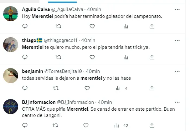 “Una maquina de errar goles”, “no podes errar tanto”, “¿Tantos goles vas a errar?” fueron algunos de los tantos comentarios hacia el delantero que está a préstamo del Palmeiras, que disputó 72 minutos en el triunfo de su equipo.