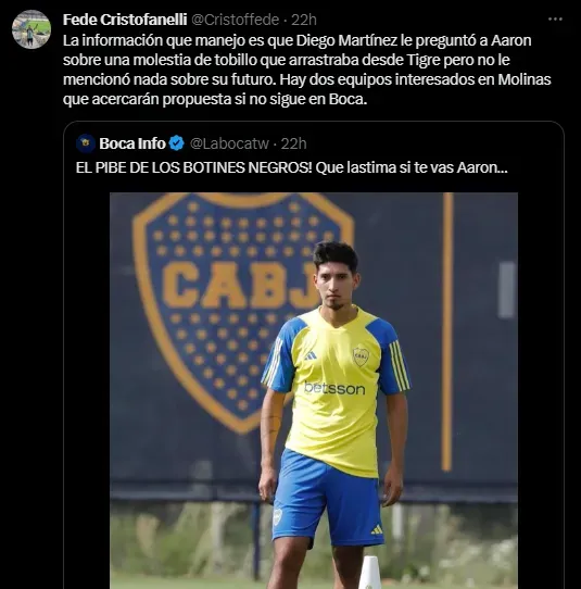 En este contexto, el periodista Federico Cristofanelli reveló que Aaron Molinas padece una molestia en el tobillo que arrastra desde las últimas semanas en Tigre, lo que le impide entrenarse 100% a la par del grupo en Boca Predio. Esto se conoció debido a una charla entre el jugador y Martínez, pero en la misma hablaron únicamente de este asunto, por lo que el DT no le manifestó nada sobre su futuro.