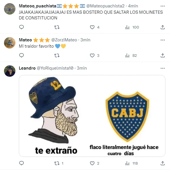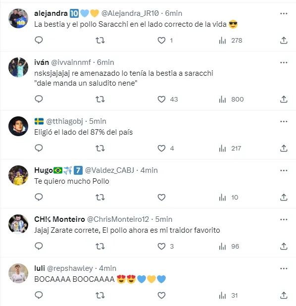 Es así que cada posteo que realiza la cuenta oficial de Boca sobre el lateral charrúa se plaga de comentarios positivos para el exfutbolista del Millonario. En esta oportunidad, Saracchi le mandó un mensaje a todos los hinchas junto a su compatriota Merentiel: “Vamo’ arriba Boca, papá”.