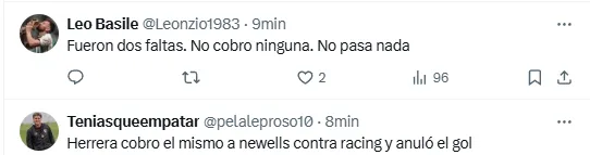Incluso en redes sociales se leyeron comentarios como “fueron dos faltas” o “le cobró lo mismo a Newell’s contra Racing y anuló el gol”, en referencia al accionar del árbitro Darío Herrera, quien decidió no sancionar falta en favor de Boca y convalidar el grito del Pincha. Por otro lado, quienes defendieron el cobro del juez, comentaron en redes: “Mancha”.