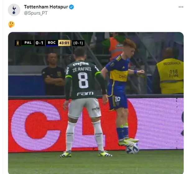 Referido a esta jugada, la cuenta oficial de Twitter del Tottenham en portugués, subió un llamativo posteo, en el que aparece la foto de Barco parado arriba de la pelota, acompañado por un emoji de una cara que se encuentra pensativa, y algunos usuarios afirman que es debido a que la forma del jugador de Boca pisando el balón, es similar a la del escudo del equipo inglés. ¿Qué querrá decir con este mensaje?