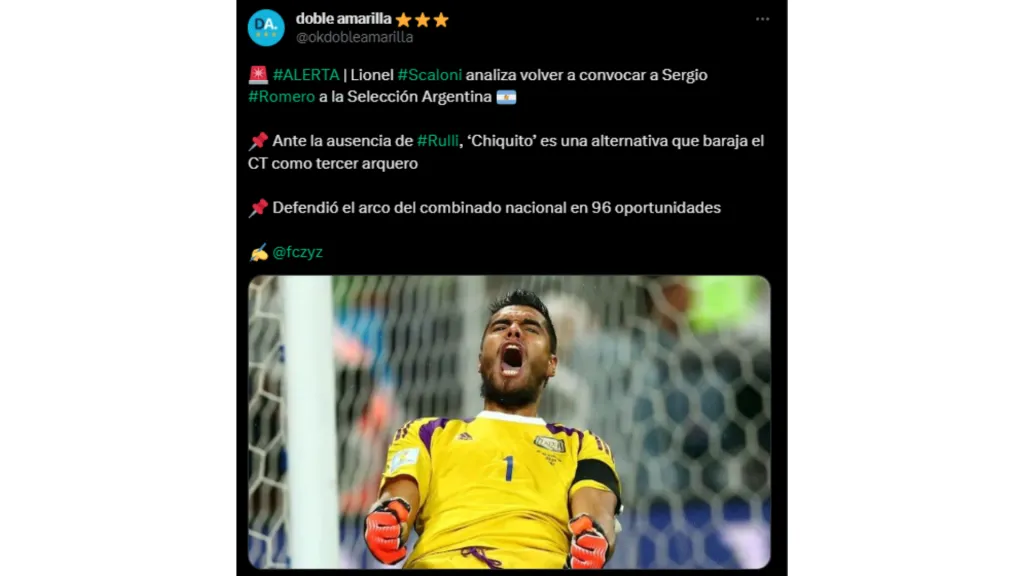 Por este motivo, en las últimas horas el medio “Doble Amarilla” reveló que Lionel Scaloni sigue de cerca a Sergio Romero debido a la lesión que sufrió Gerónimo Rulli para que el arquero de Boca vuelva a la Selección acompañando a Emiliano Martínez y Franco Armani como el tercer guardameta de la próxima fecha FIFA en la que el campeón del mundo debutará en las Eliminatorias de cara al próximo Mundial en donde enfrentará a Ecuador y Bolivia el 7 y 12 de septiembre respectivamente.