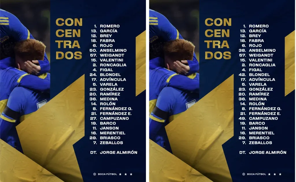 Resulta que Blondel, Campuzano y Anselmino utilizarán un número en el campeonato local (24, 27 y 50, respectivamente), pero en la Copa Libertadores se ven obligados a utilizar el del integrante a quien reemplazan en la lista. El club de la Ribera había publicado la nómina con sus dorsales originales, pero debió corregirlos.