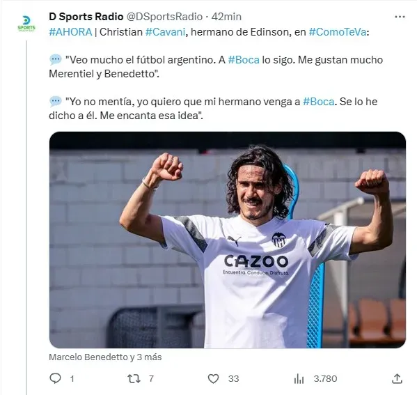 “Yo no mentía, yo quiero que mi hermano venga a Boca. Se lo he dicho a él. Me encanta esa idea“, aseguró Christian Cavani durante el reportaje que le hicieron en Cómo Te Va para DSports. Incluso se mostró informado sobre el presente del equipo de Jorge Almirón: “Veo mucho el fútbol argentino. A Boca lo sigo. Me gustan mucho Merentiel y Benedetto“.