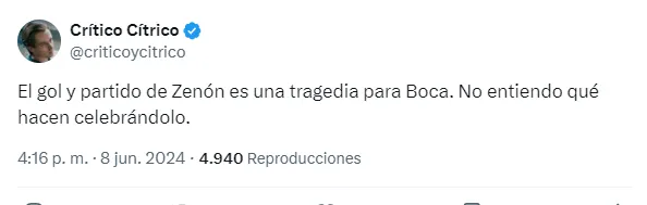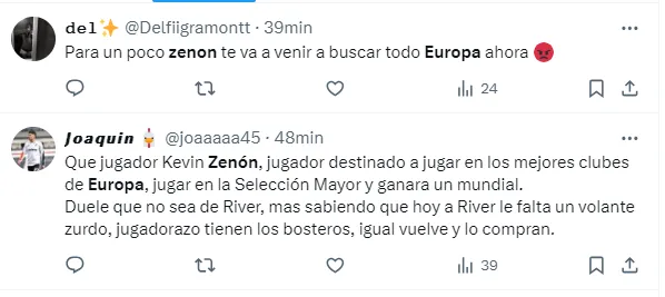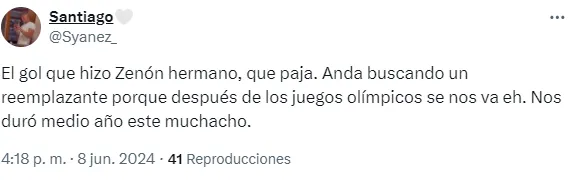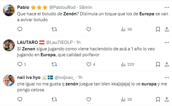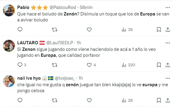 “Anda buscando un reemplazante porque después de los juegos olímpicos se nos va eh”, “Zenón, jugador destinado a jugar en los mejores clubes de Europa”, “Para un poco zenon te va a venir a buscar todo Europa ahora”, fueron algunos de los comentarios de los hinchas del elenco de la Ribera sobre el nivel del futbolista de 22 años.