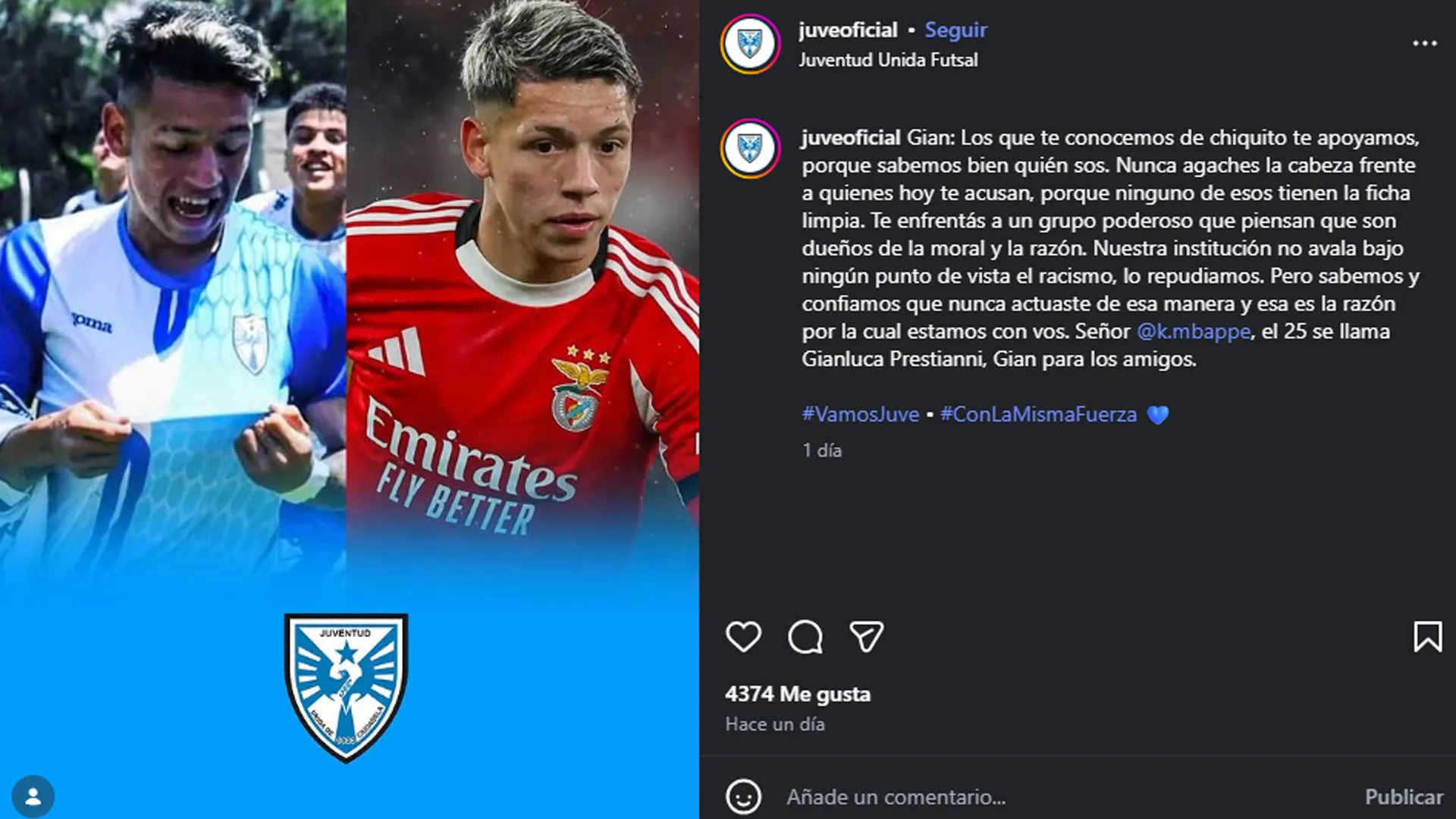 Y si bien parece que el argentino enfrenta una batalla en desventaja, no es únicamente el apoyo de su club el que tiene, ya que desde Argentina también han reflejado su respaldo al futbolista surgido de Vélez. En las últimas horas, quien se pronunció fue el Club Juventud Unida de Futsal, donde Prestianni dio sus primeros pasos.