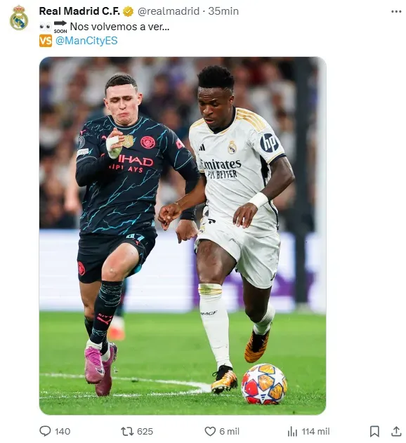 Palpitando un nuevo capítulo de este clásico moderno, desde las redes sociales del Madrid salió un desfiante mensaje para su par inglés. “Nos volvemos a ver…”, escribió la cuenta oficial del club, con una imagen de la última eliminatoria entre ambos, que lo tuvo como vencedor.