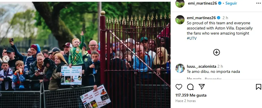 “Estoy muy orgulloso de este equipo y de todos los que forman parte del Aston Villa. Especialmente de los hinchas, que estuvieron increíbles esta noche”, publicó Dibu en su cuenta de Instagram junto a algunas fotos suyas en el partido y de un pequeño hinchas que esperaba su saludo con su camiseta y un cartel.