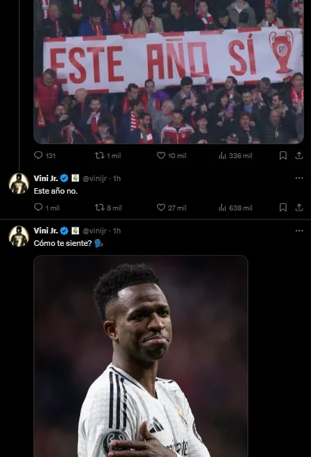 En X (ex Twitter) posteó una foto suya nuevamente señalando el parche y escribió “¿Cómo se siente?“. Además, respondió a una página de Real Madrid que chicaneó al Atleti con una foto de su público, que sostenía una pancarta que decía “este año sí”. Vini, picante, expresó: “Este año no“. Y por último, en su cuenta de Instagram dejó un mensaje un poco más largo: “MADRID HAY UNO SOLO!!!! que bueno es ser del mejor Club del mundo!!!“. Lógicamente, sus publicaciones se hicieron virales entre los hinchas merengues.