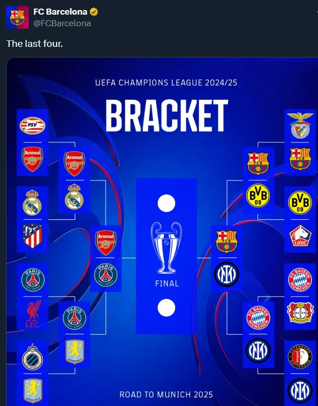 Lisa y llanamente, el Blaugrana compartió una imagen que muestra el cuadro de la Champions League. Sí, lo sucedido anteriormente en la instancia de octavos de final, lo acontecido en el presente en los cuartos de final y lo que resta de la competición, con las semifinales y con la gran final de la ciudad de Munich como frutilla del postre.