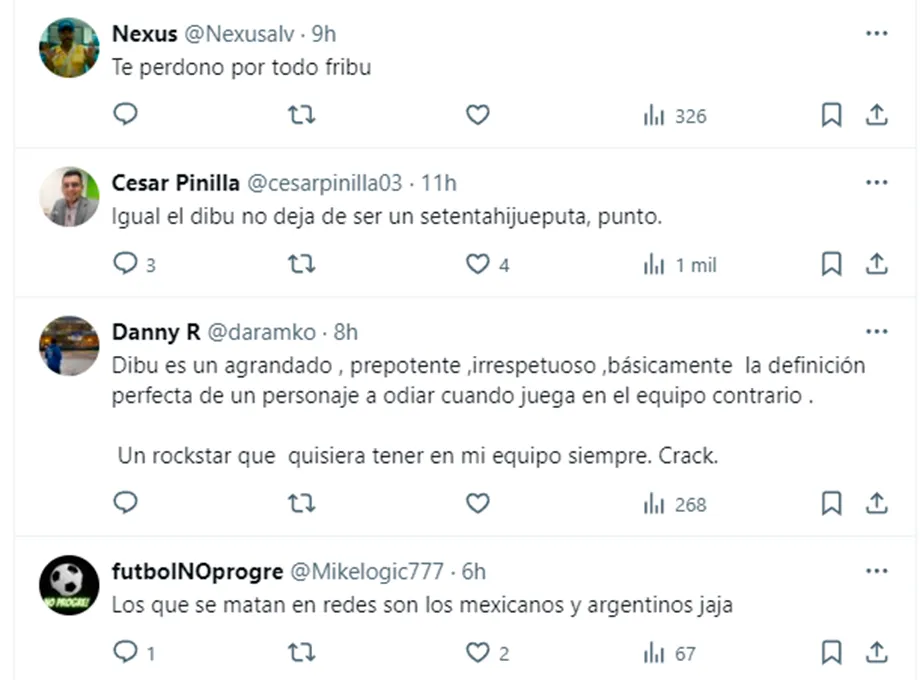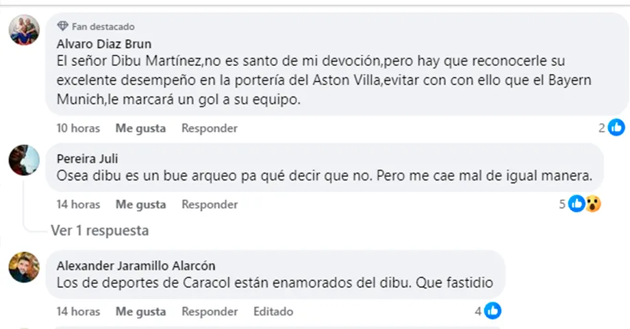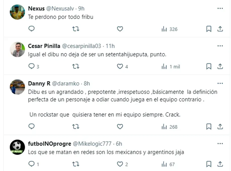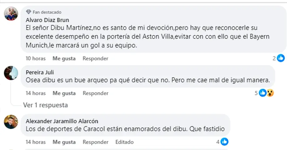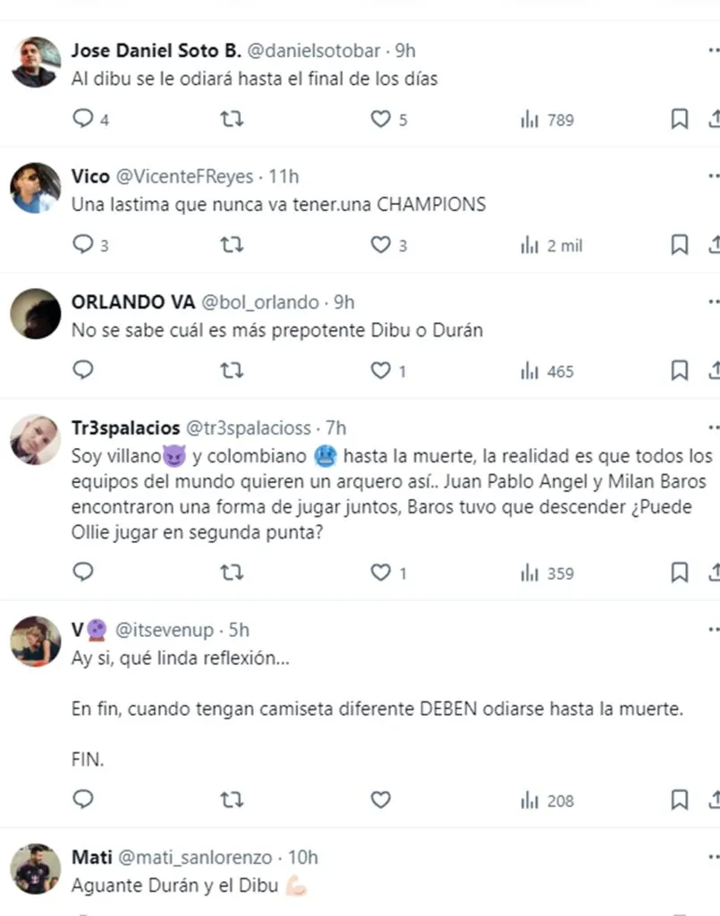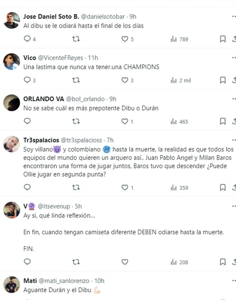“El Dibu y Ospina fueron re panas en Arsenal”, recordó uno buscando dejar de lado las diferencias. “Con un Dibu ya hubiésemos ganado algo”, dijo otro haciendo alusión a la Selección Colombia. “Soy Villano y colombiano hasta la muerte. La realidad es que todos los equipos del mundo quieren un arquero así”, reconoció un tercero. “Dibu es un agrandado , prepotente ,irrespetuoso ,básicamente la definición perfecta de un personaje a odiar cuando juega en el equipo contrario. Un rockstar que quisiera tener en mi equipo siempre. Crack”, ironizó uno más.