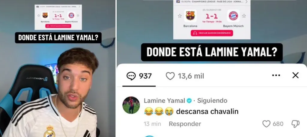 Cuando Harry Kane empató provisoriamente para los bávaros, el TikToker Javibridge3, reconocido fanático del Real Madrid y quien tiene una cuenta con 1.8 millones de seguidores, aprovechó para publicar un corto video preguntándose: “¿Dónde está Lamine Yamal?“, una vez terminado el partido y con la goleada consumada para el Barcelona, la respuesta no se hizo esperar.