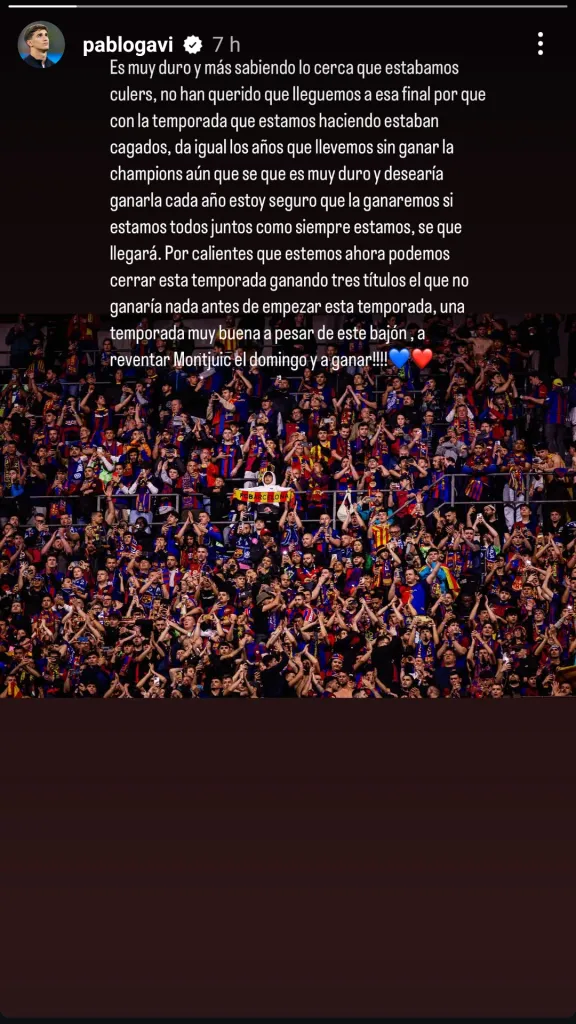 A través de su cuenta de Instagram, Gavi envió un mensaje a sus hinchas en el que deslizó que a Barcelona no le permitieron acceder a la definición por el título: “Es muy duro y más sabiendo lo cerca que estábamos, culers. No han querido que lleguemos a esa final porque con la temporada que estamos haciendo estaban cagados“.