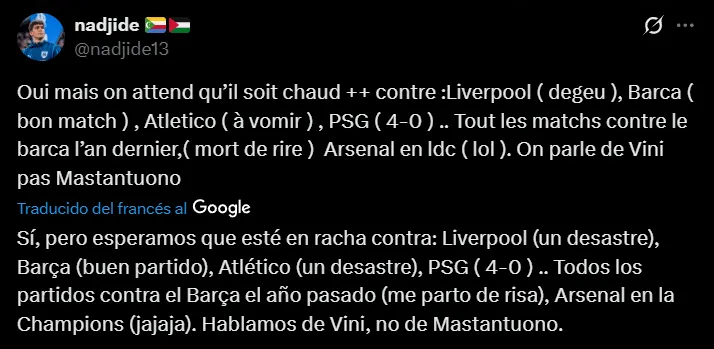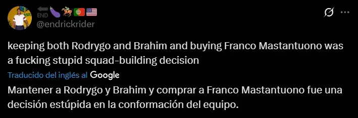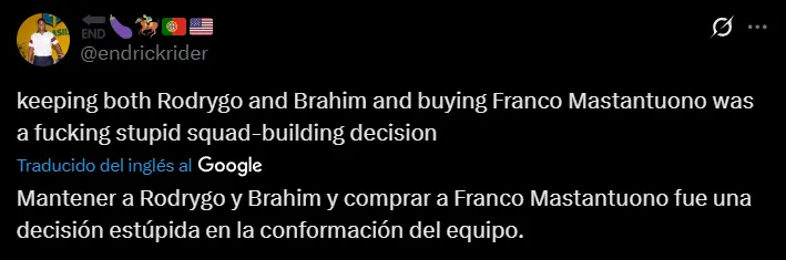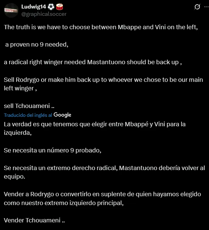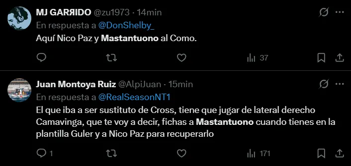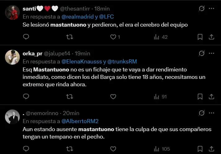 Así como se refirieron puntualmente a Mastantuono, también hicieron foco en varios futbolistas de la plantilla que lidera Xabi Alonso, de quienes solicitaron que emigren en el próximo mercado de pases. Incluso, también aparecieron comentarios en donde exclamaron por el regreso de Nico Paz, que se encuentra en Como 1907.
