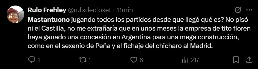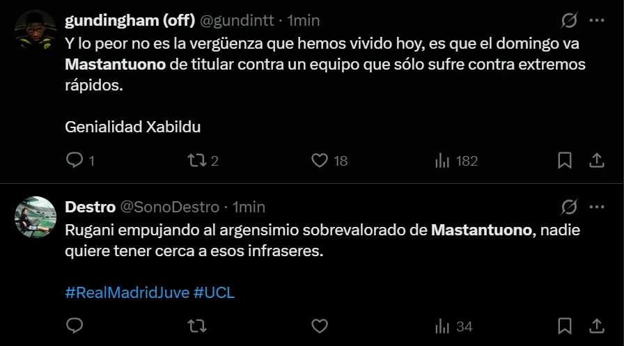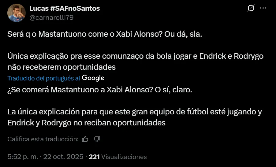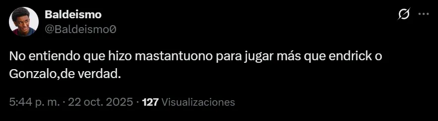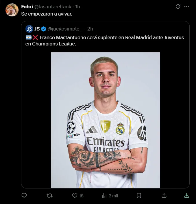 “No entiendo qué hizo Mastantuono para jugar más que Endrick o Gonzalo, de verdad”, exclamó el usuario @Baldeismo0 en Twitter, aunque no fue el único que lo criticó, ya que a pesar de los minutos que sumó hasta el momento (599′), solamente convirtió un gol y aportó una asistencia. “Se empezaron a avivar”; “Es un asco Mastantuono y Xabi Alonso lo sigue poniendo unos minutos”, fueron otras de las críticas que hubo contra el nacido en Azul.