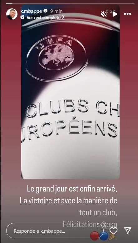 A través de su cuenta de Instagram, fue Mbappé quien realizó un posteo en el que se mostró muy orgulloso del título que conquistó el club parisino, en el que jugó entre 2017 y 2024 después de arribar procedente desde AS Mónaco a cambio de 180 millones de euros.