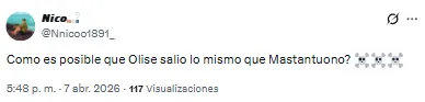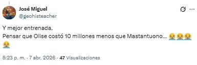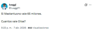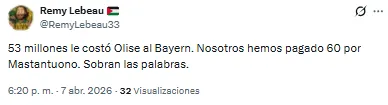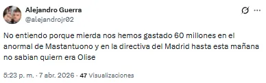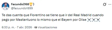 “No entiendo por qué nos hemos gastado 60 millones en Mastantuono y la directiva hasta esta mañana no sabía quién era Olise”, destacó uno de los usuarios. “Te das cuenta que Florentino se tiene que ir del Real Madrid cuando pagó por Mastantuono lo mismo que el Bayern por Olise”, soltó otro de ellos.