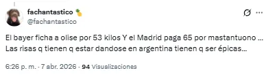 En ese contexto, los hinchas criticaron a la dirigencia de Real Madrid por haber desembolsado más de 60 millones de euros en el pase del argentino y lo compararon con Michael Olise, figura de Bayern Múnich que tuvo un costo similar para llegar a ese club.