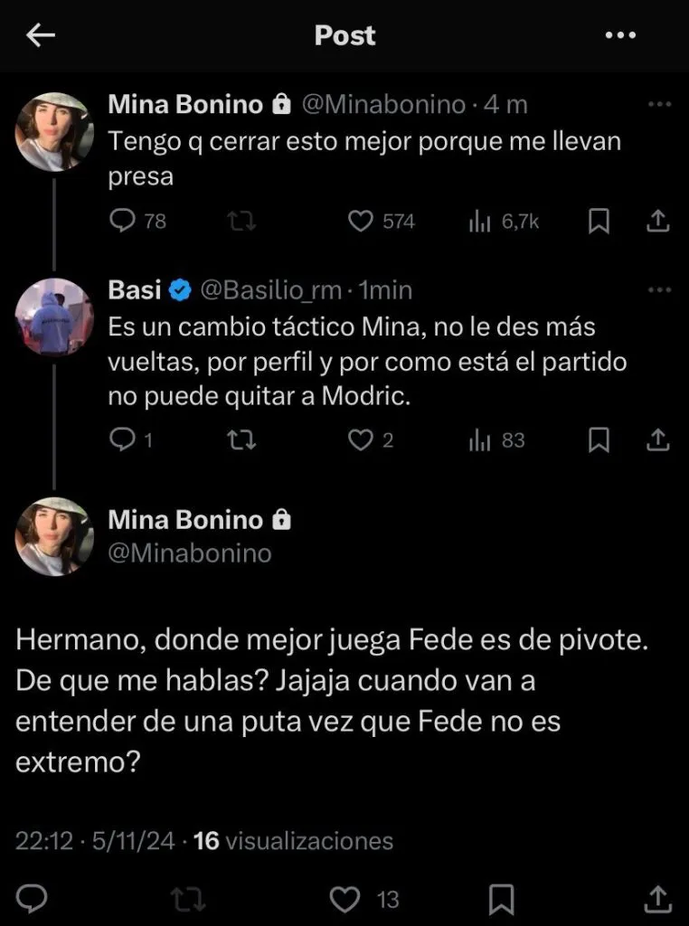 “Tengo que cerrar esto porque me llevan presa“, publicó y se contuvo Bonino. Sin embargo, un usuario opinó: “Es un cambio táctico, Mina. No le des más vueltas. Por perfil y por cómo está el partido no puede quitar a Modric”. Esta respuesta generó la reacción de la periodista: “Hermano, dónde mejor juega Fede es de pivote. ¿De qué me hablás? Jajaja. ¿Cuándo van a entender de una puta vez que Fede no es extremo?“.