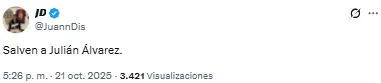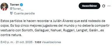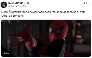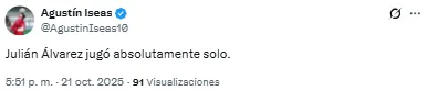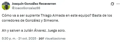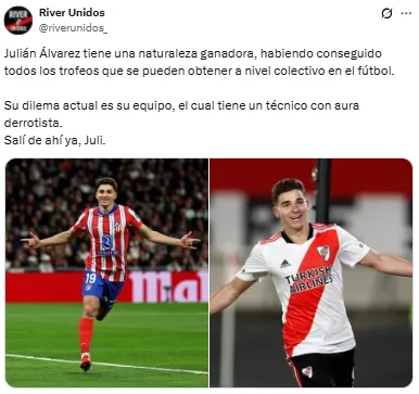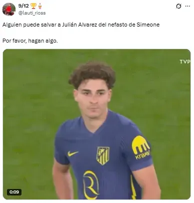 “Salven a Julián Álvarez”, escribieron varios de los hinchas, que pidieron que la Araña se cambie de equipo en el próximo mercado de pases. Otros, destacaron que “juega solo” y que fue una mala decisión mudarse a la capital española para jugar bajo las órdenes del Cholo Simeone.