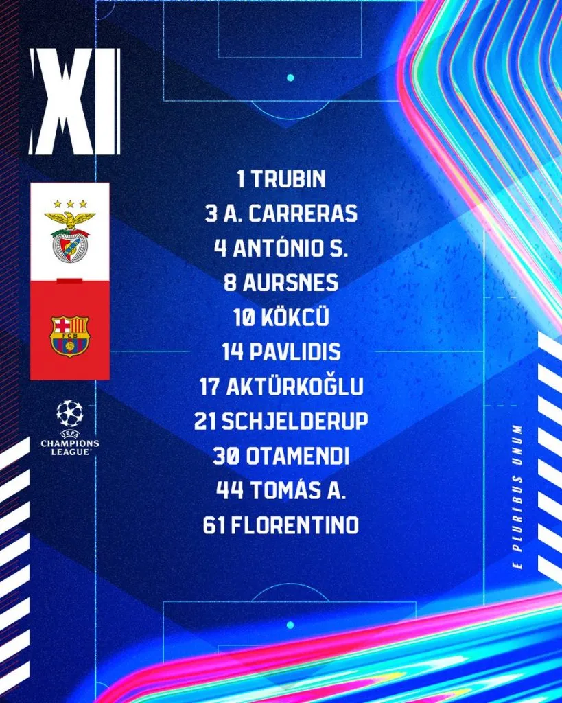 Anatoli Trubin; Tomás Araújo, Antonio Silva, Nicolás Otamendi, Álvaro Carreras; Fredrik Aursnes, Florentino Luis, Orkun Kökçü; Kerem Aktürkoğlu, Vangelis Pavlidis y Andreas Schjelderup.