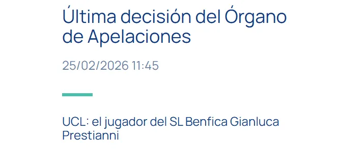 Decisión del AB sobre la suspensión provisional del jugador del SL Benfica Gianluca Prestianni.