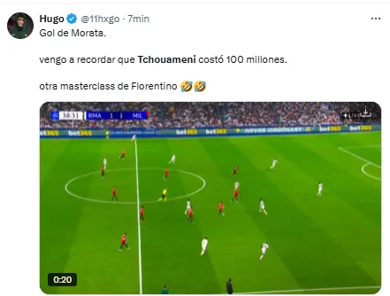 Además, Tchouaméni fue uno de los señalados en el primer y segundo gol del conjunto italiano: en la apertura del marcador, perdió la marca y liberó a Malick Thiaw para que marque de cabeza, y luego no siguió el rastro de Álvaro Morata antes de que recupere el rebote que dejó Lunin.