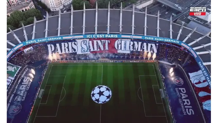Ambiente espectacular en el Parque de los Príncipes, con tifo del PSG, pirotecnia controlada alrededor del estadio con los colores clásicos del club, show de luces y un DJ motivando al público.