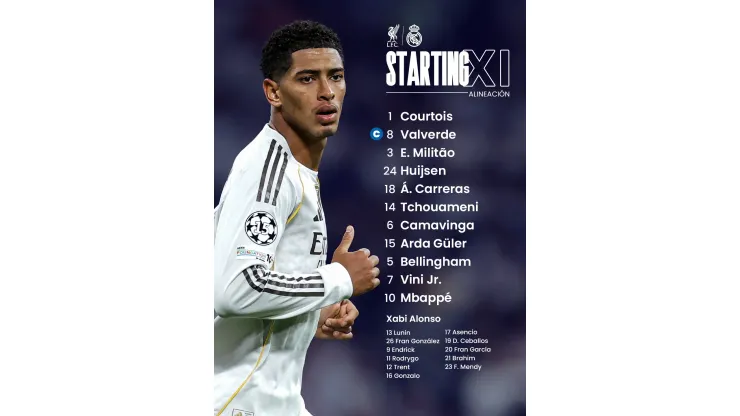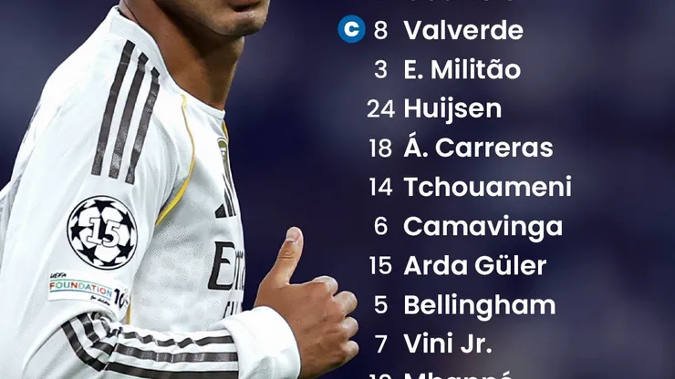 Thibaut Courtois; Federico Valverde, Éder Militao, Dean Huijsen, Álvaro Carreras; Aurélien Tchouaméni, Jude Bellingham, Eduardo Camavinga, Arda Güler; Kylian Mbappé y Vinícius Jr.