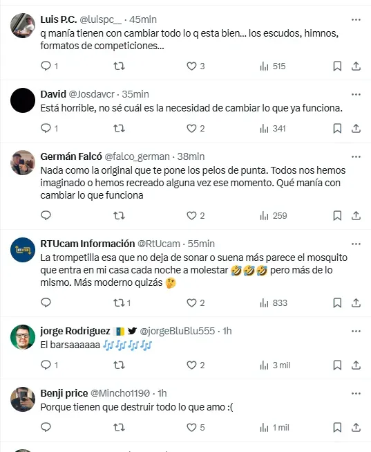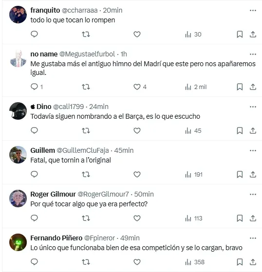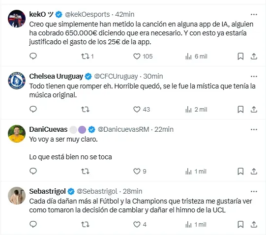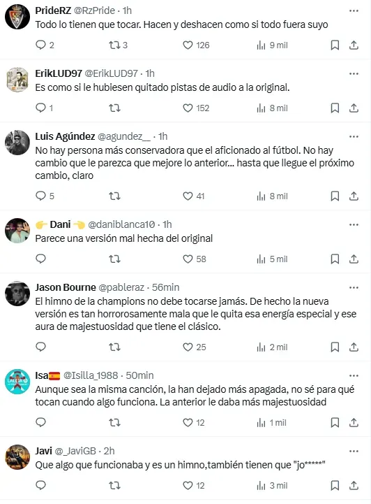 “Seguramente han metido la canción en alguna app de IA”, “horrible quedó”, “lo que está bien no se toca”, “se fue la mística”, “no sé cuál es la necesidad de cambiar lo que ya funciona”, fueron algunos de los comentarios que aparecieron en publicaciones de la plataforma X (ex Twitter) relacionadas al nuevo himno de la Champions League. ¿Habrá marcha atrás?