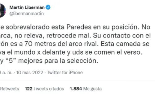 “Que sobrevalorado esta Paredes en su posición. No marca, no releva, retrocede mal. Su contacto con el balón es a 70 metros del arco rival. Esta camada se lleva el mundo por delante y ustedes se comen el verso. Hay ‘5’ mejores para la Selección”, escribió el periodista en su cuenta oficial de Twitter. Una durísima crítica.