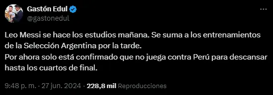 En la misma línea, Gastón Edul explicó que este viernes por la mañana se realizará estudios para constatar el grado de la lesión y ver los pasos a seguir. Por la tarde, Messi se sumará a los entrenamientos con el resto de los dirigidos por Lionel Scaloni, que prepararán el duelo ante Perú.