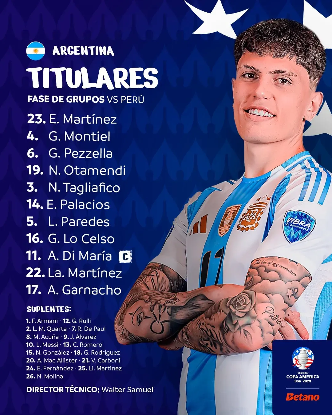 En el Hard Rock Stadium de Miami, en el marco de la fecha 3 del GrupoA de la Copa América de Estados Unidos, la Selección Argentina venció a la Selección de Perú por 2 a 0, por lo que de esta manera clasificó a los cuartos de final con puntaje perfecto.