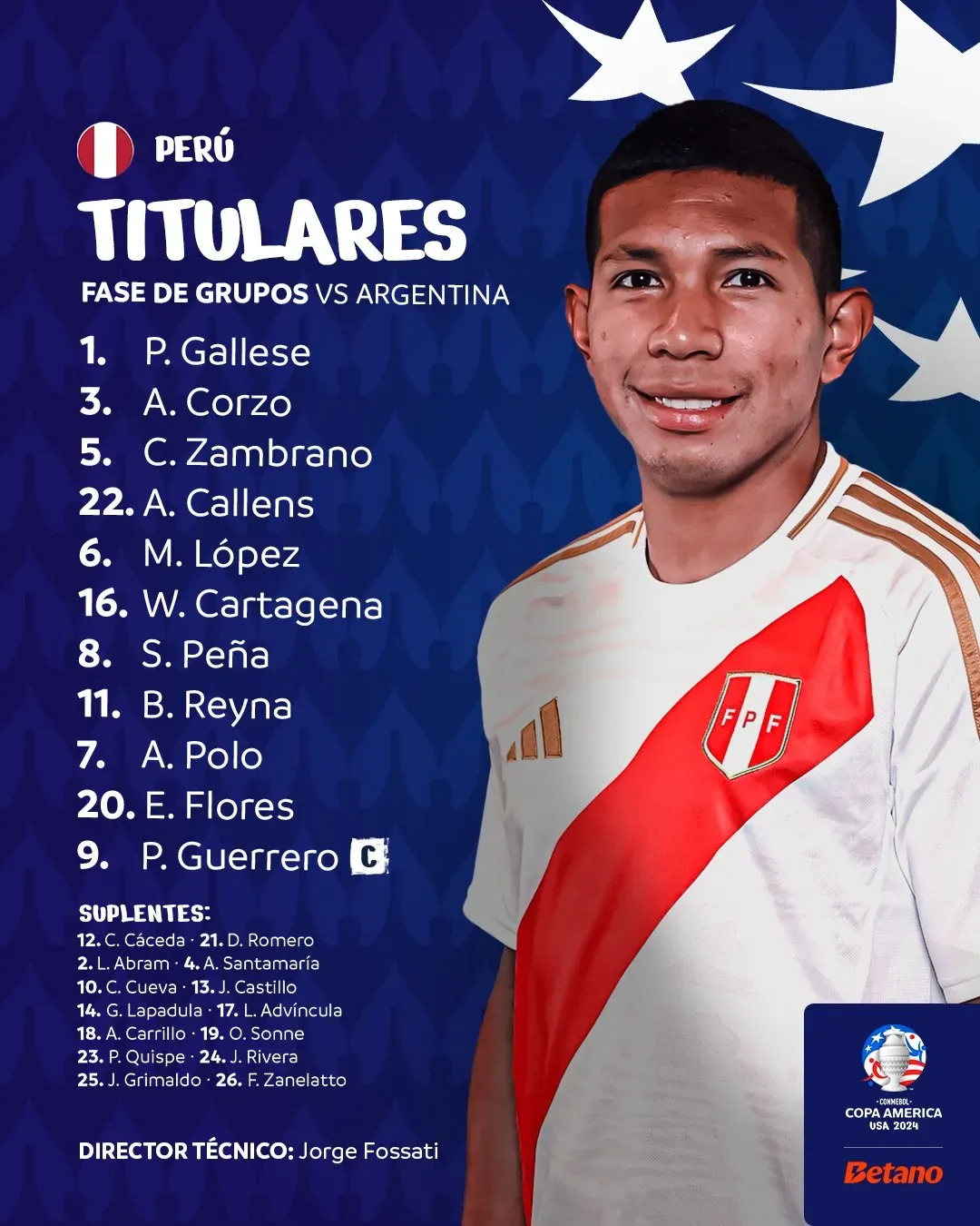 La Rojiblanca sale a la cancha con: Pedro Gallese; Aldo Corzo, Carlos Zambrano, Alexander Callens; Andy Polo, Sergio Peña, Wilder Cartagena, Bryan Reyna, Marcos López; Edison Flores y Paolo Guerrero.