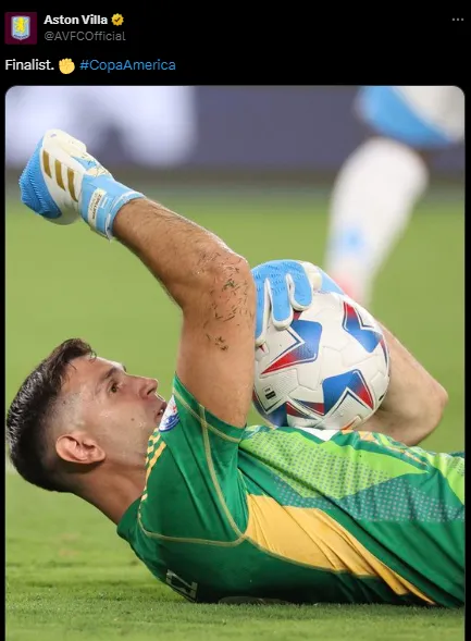 En las redes sociales, siendo las 3:30 de la mañana en Inglaterra, la cuenta oficial de Aston Villa bancó a su arquero y describió el momento que está viviendo con apenas una palabra: “Finalista“.