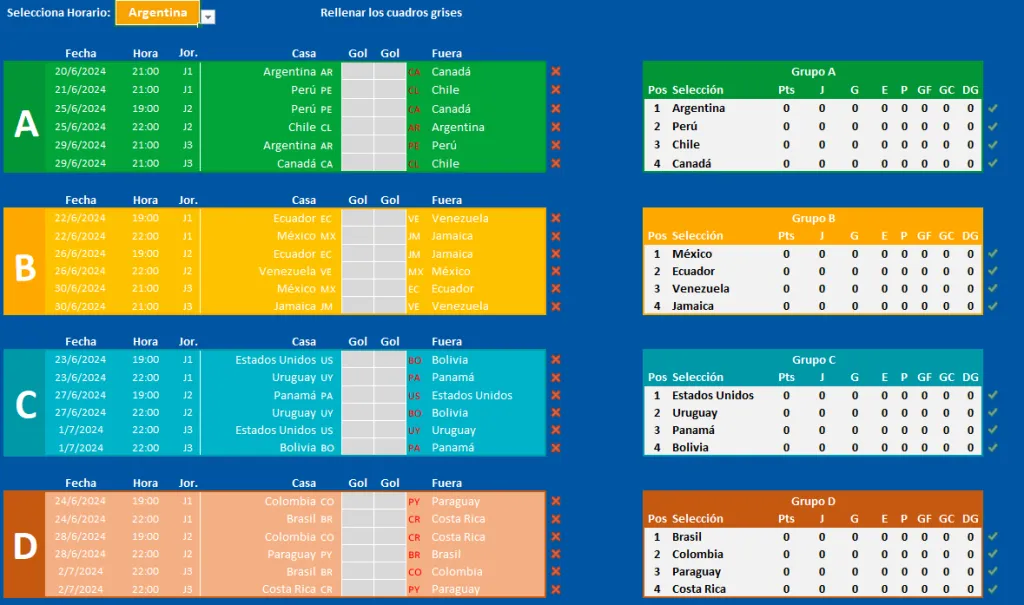 En la planilla se podrá cambiar celdas por resultados y se verán impactados en la tabla de puntos según indique el marcador victoria, empate o derrota. Además, también existe la posibilidad de ajustar el huso horario dependiendo de la ubicación del usuario. ¡Una genialidad!