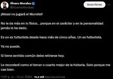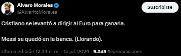 El astro se resintió y se fue al banco de suplentes, en dónde soltó todas sus lágrimas. Las imágenes entristecieron a todos los futboleros, menos a Álvaro Morales, que soltó un durísimo tuit cuando la transmisión mostraba a un Messi quebrado en llanto.