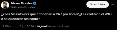 Lejos de quedarse con esa brutal crítica, el mexicano comparó situaciones similares que vivió el delantero portugués y tomó partido por el Bicho. “¿Y los Messilovers que criticaban a CR7 por llorar? ¿Les cortaron el WIFI o se quedaron sin saldo?”, disparó.
