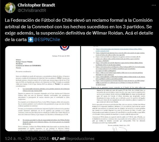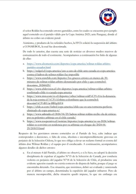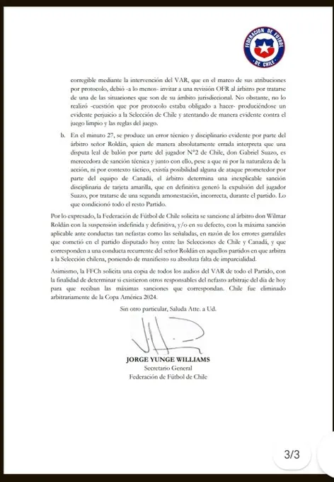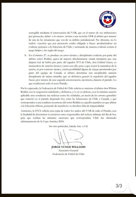 La FFCh denunció “falta de imparcialidad” en el duelo frente a los canadiense, la cual les produjo una “profunda y fuerte desazón” tras confirmarse la eliminación. Por ello, cargaron directamente contra Wilmar Roldán con un pedido formal dirigido a CONMEBOL: “Por lo expresado, la Federación de Fútbol de Chile solicita se sancione al árbitro don Wilmar Roldán con la suspensión indefinida y definitiva, y/o en su defecto, con la máxima sanción aplicable ante conductas tan nefastas como las señaladas“, señala el comunicado del ente chileno. Fuertísima denuncia.