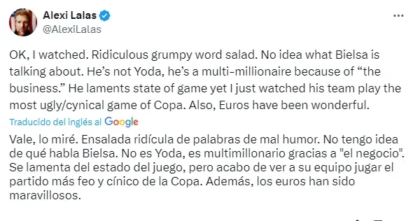 “Vale, lo miré. Ensalada ridícula de palabras de mal humor. No tengo idea de qué habla Bielsa. No es Yoda, es multimillonario gracias a “el negocio”. Se lamenta del estado del juego, pero acabo de ver a su equipo jugar el partido más feo y cínico de la Copa. Además, las Euro han sido maravillosas”, respondió Lalas.