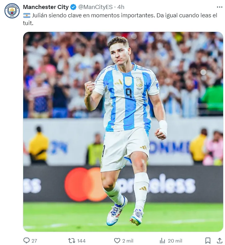 Por la mañana del viernes, el propio Manchester City reaccionó en sus redes a lo que fue la actuación de su futbolista. “Julián siendo clave en momentos importantes. Da igual cuando leas el tuit“, escribió el club inglés, en una clara muestra de apoyo para la Araña.