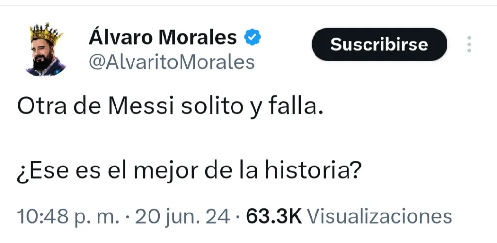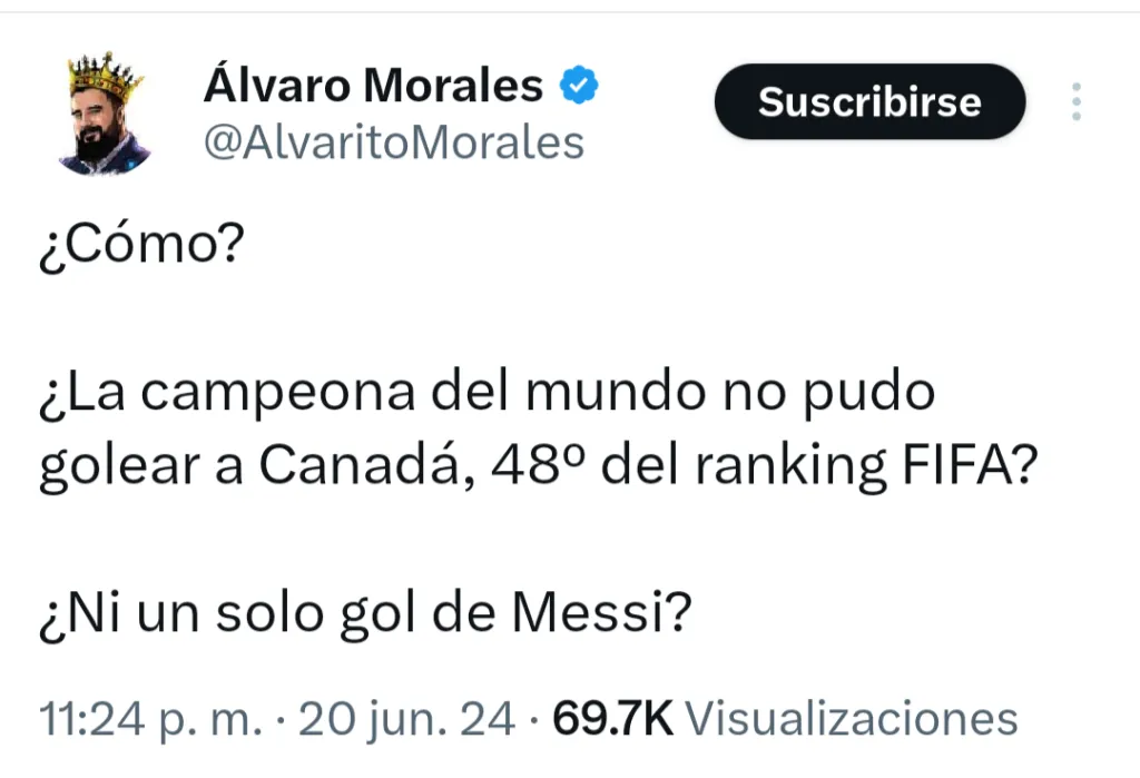 Algo corto en sus argumentos pero con la tenacidad de siempre, Álvaro Morales seleccionó cuidadosamente qué elementos incluir y cuáles omitir para sintetizar el encuentro que terminó con victoria 2-0 para el seleccionado defensor del título conquistado en 2021 en Brasil. “¿Cómo? ¿La campeona del mundo no pudo golear a Canadá, número 48 del Ranking FIFA? ¿Ni un solo gol de Messi?”, escribió en X.