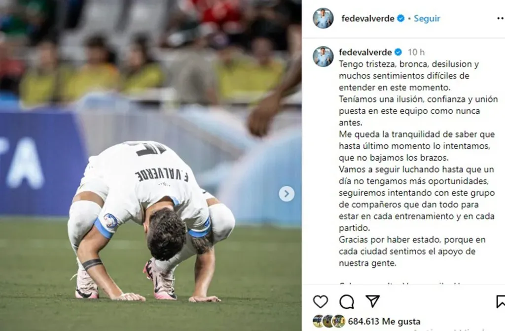 La eliminación de la Selección de Uruguay en semifinales ante Colombia, que también dejó un triste episodio en las tribunas una vez finalizado el encuentro, por los incidentes que se desataron entre hinchas de ambas parcialidades en las tribunas poniendo incluso en riesgo la integridad de las familias de los futbolistas, golpeó fuerte a Federico Valverde, quien había llegado a la competencia como campeón de Champions League con Real Madrid y capitán designado por Marcelo Bielsa.